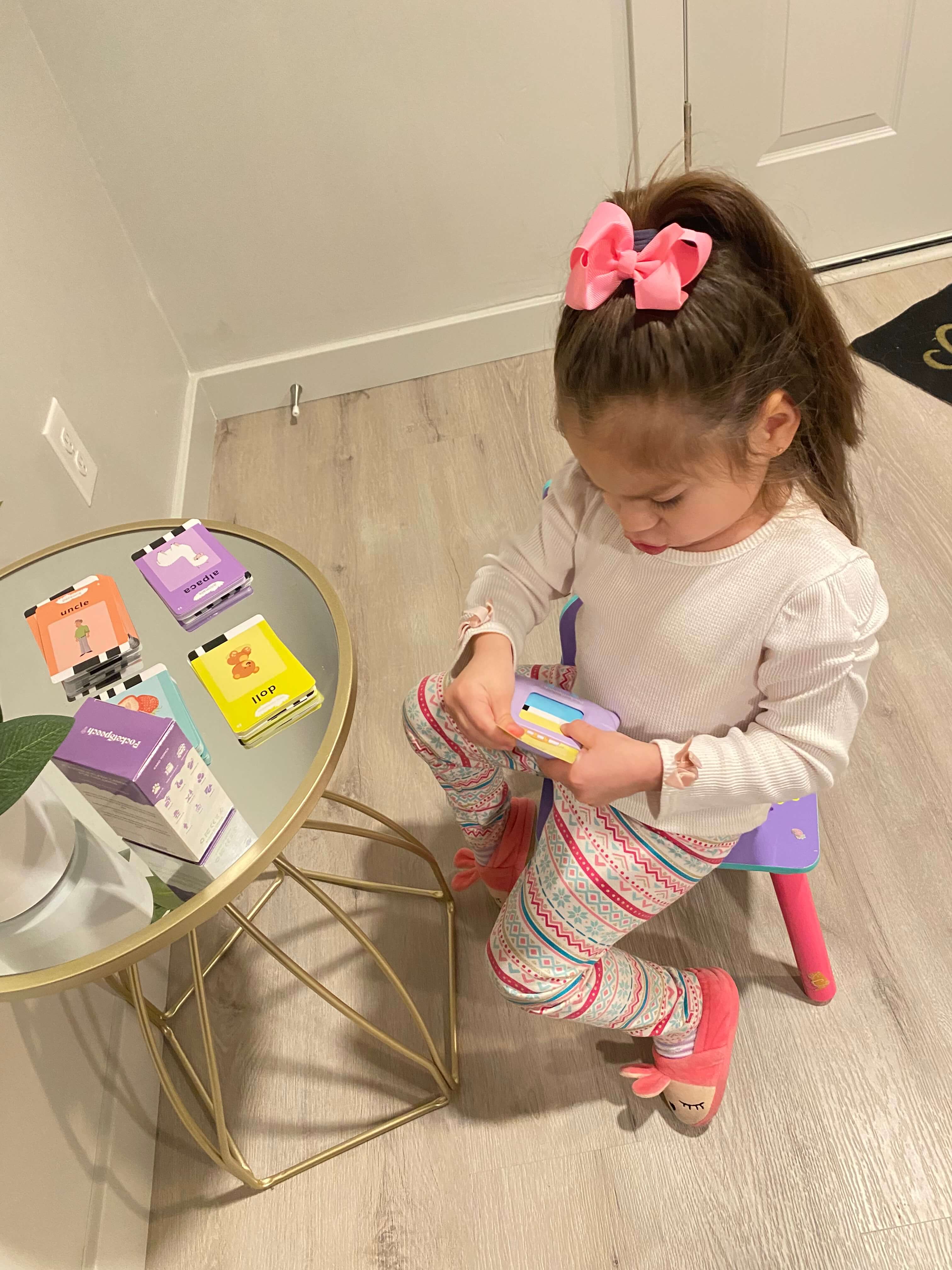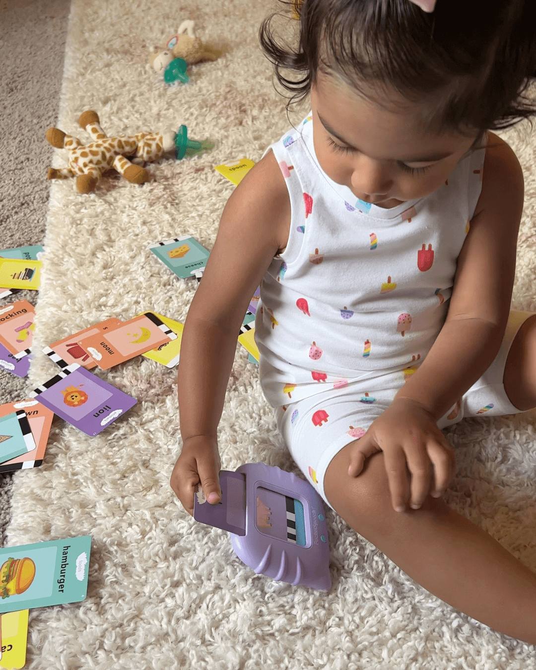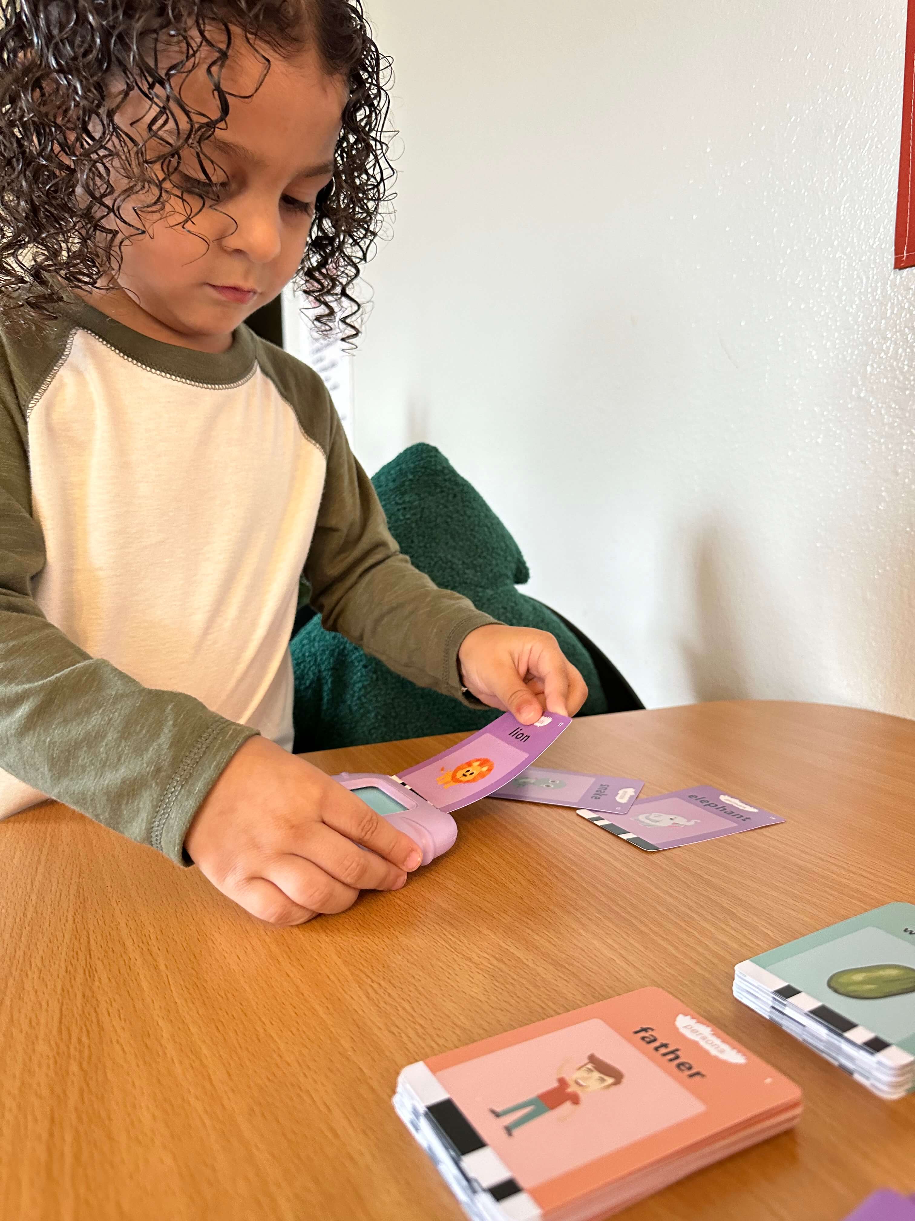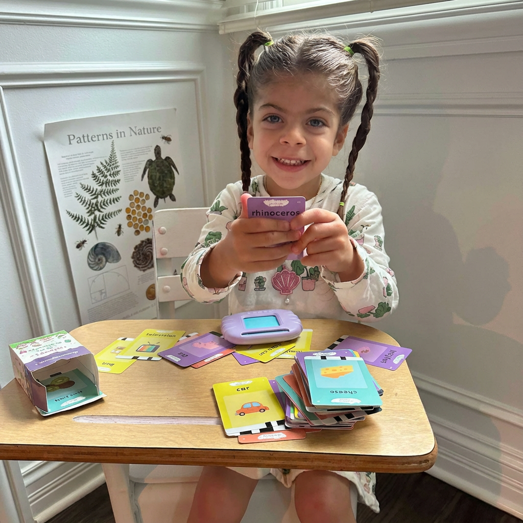 Your child inserts the card, hears the word, and can repeat as many times as needed. Screen-free, self-directed learning in just 10-15 minutes a day.